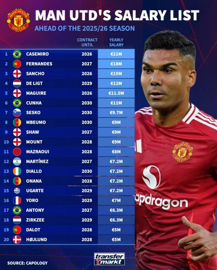 直播吧8月24日讯 德转盘点了曼联球员年薪榜单,其中卡塞米罗2100万欧居首,桑乔1500万欧第三,具体如下(合同到期时间+年薪):